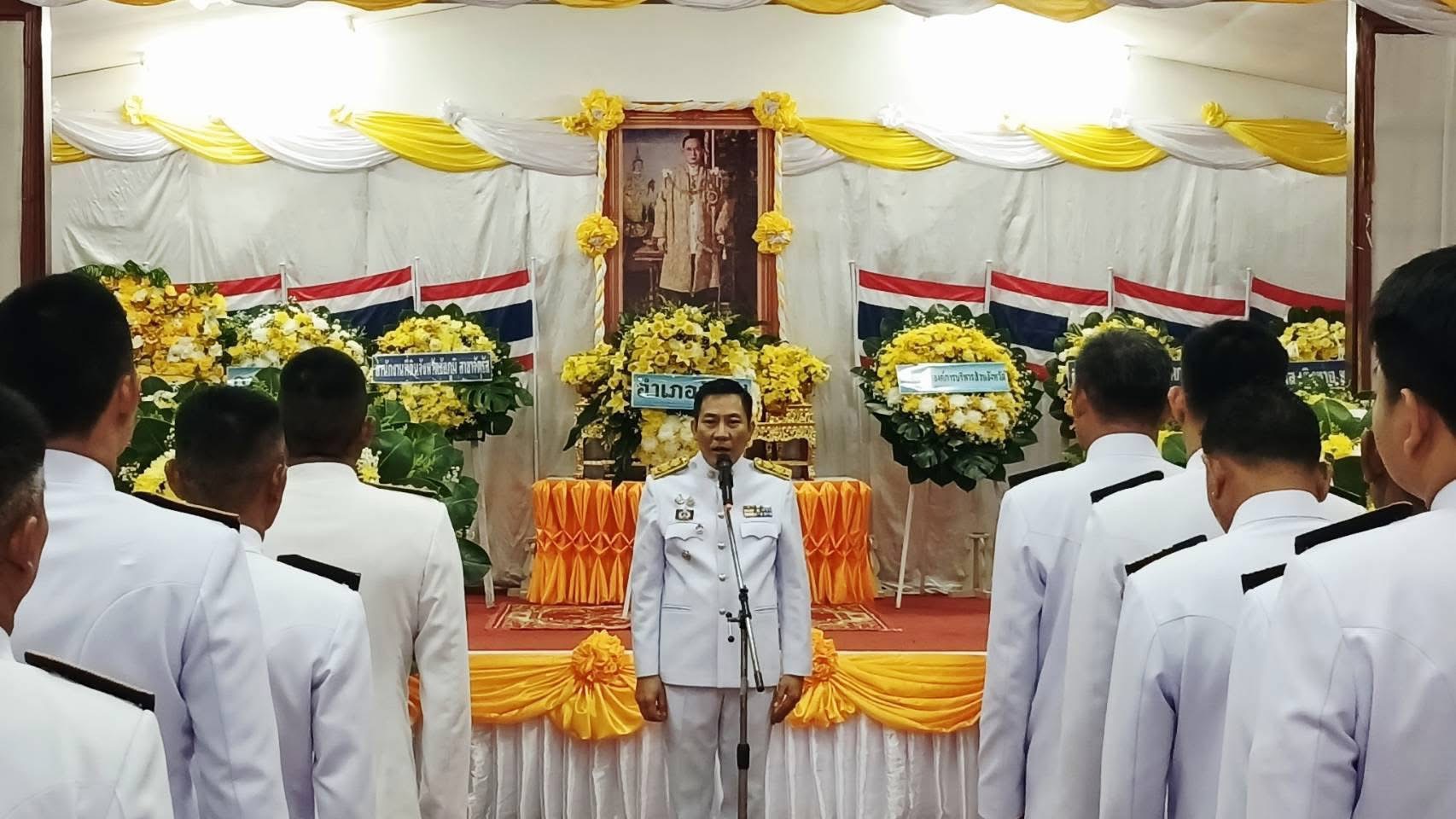 พิธีวางพวงมาลาเบื้องหน้าพระบรมฉายาลักษณ์ พระบาทสมเด็จพระบรมชนกาธิเบศร มหาภูมิพลอดุลยเดชมหาราชบรมนาถบพิตร ผู้ร่วมพิธียืนสงบนิ่งน้อมรำลึกในพระมหากรุณาธิคุณ เนื่องในวันนวมินทรมหาราช 13 ตุลาคม 2568